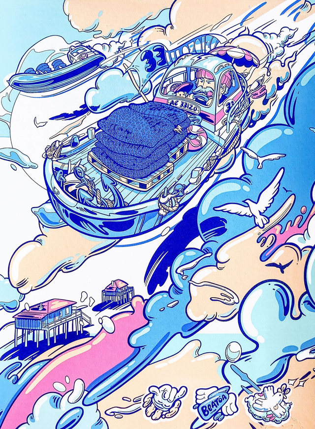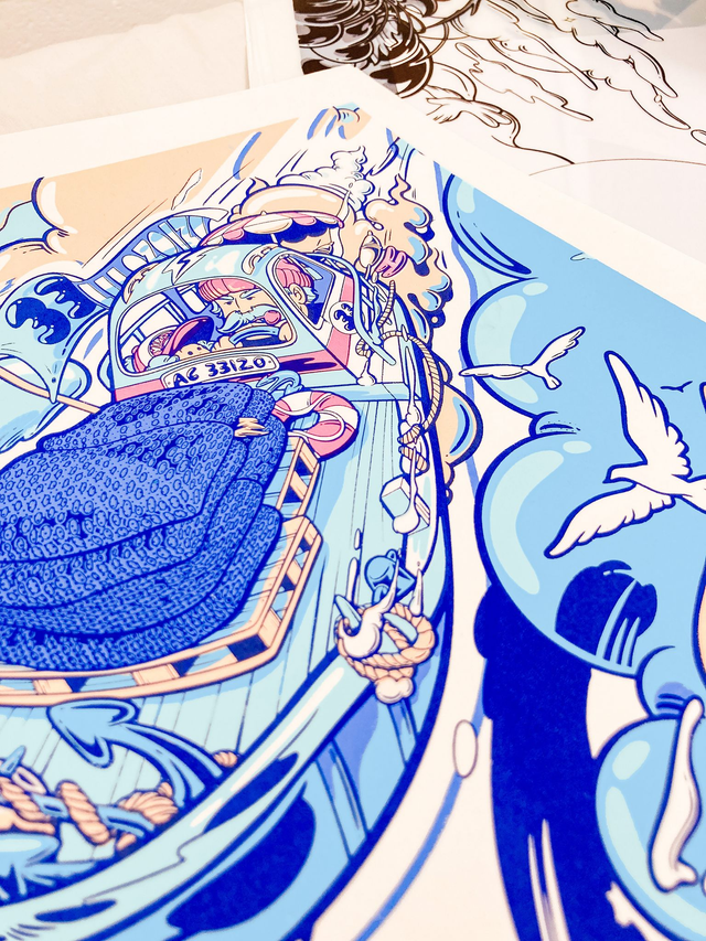 Original serigraphy—a wave with its own water cycle, blending tattoo, motorcycle, rebel, and surf vibes.